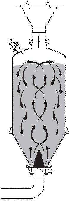 4. 壓縮空氣從N個向上的噴嘴中以脈沖循環的方式噴出。通常壓縮空氣脈沖的范圍從大約2秒或更短的短啟動時間,到更長可超過60秒的停止時間。這個混合動作向上提升干散固體的中央部分,并同時向下移動干散固體的周邊部分,翻轉滾動物料以達到均勻的混合。